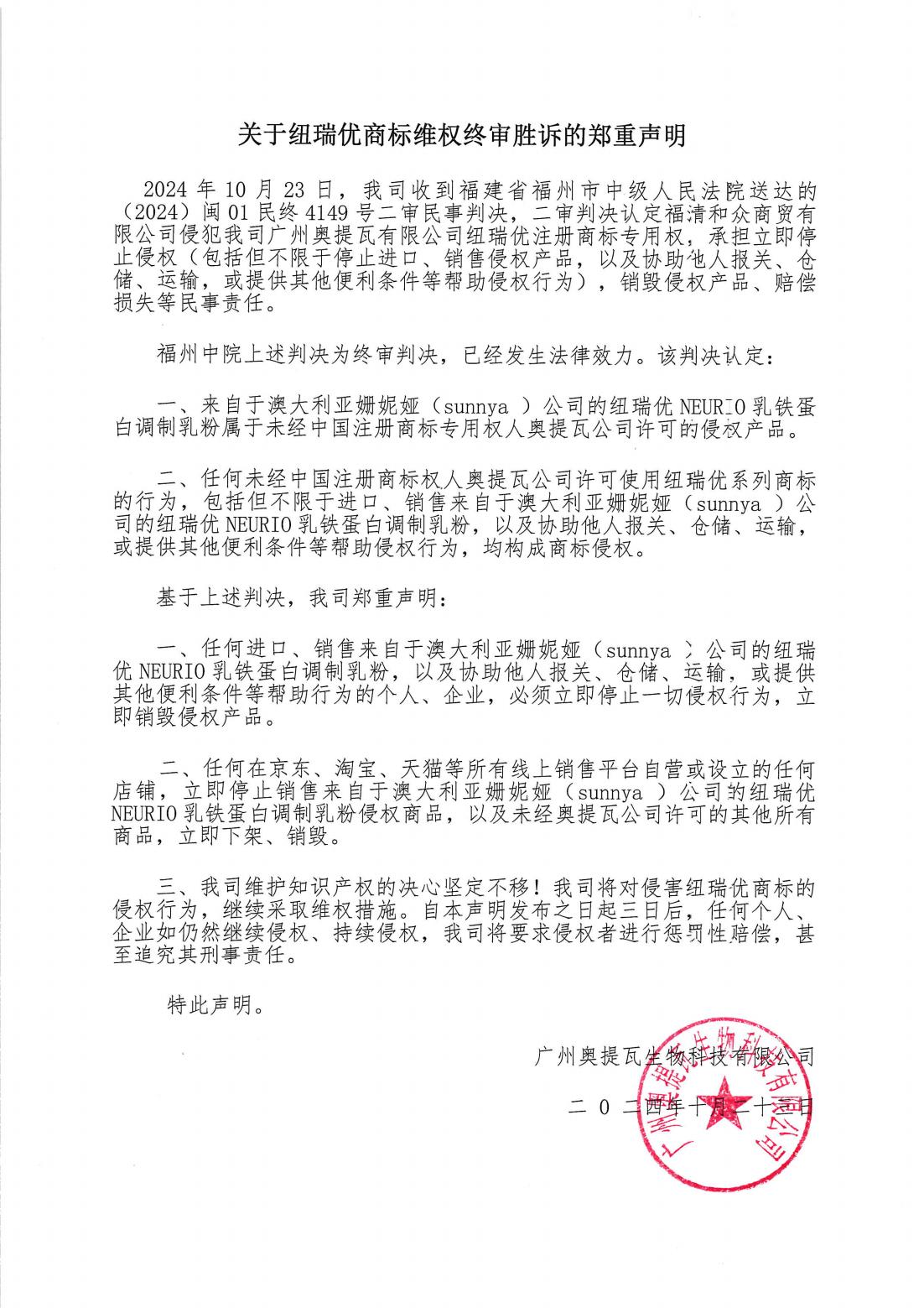 關于紐瑞優(yōu)商標維權終審勝訴的鄭重聲明